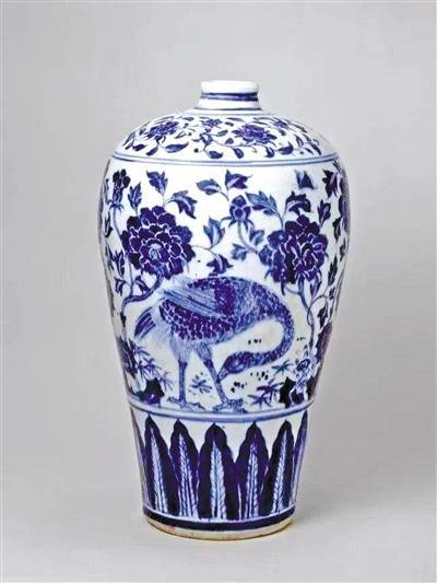 r r明代正统青花孔雀牡丹图 梅瓶(1986年耿宝昌先生 捐献给故宫博物院收藏)r r