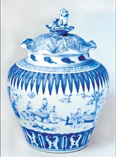 r r耿宝昌先生经手鉴定的明代成化青花高士图盖罐r r